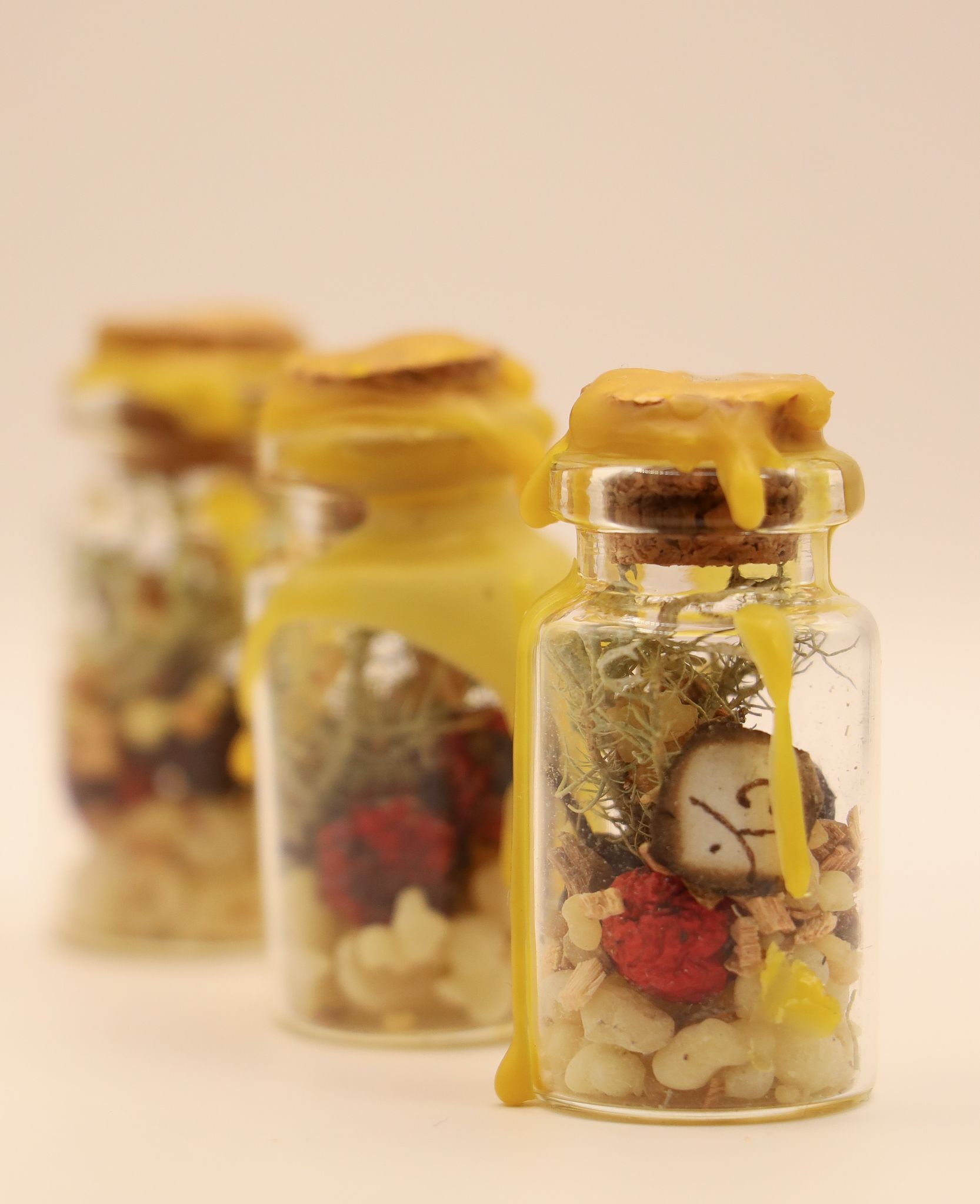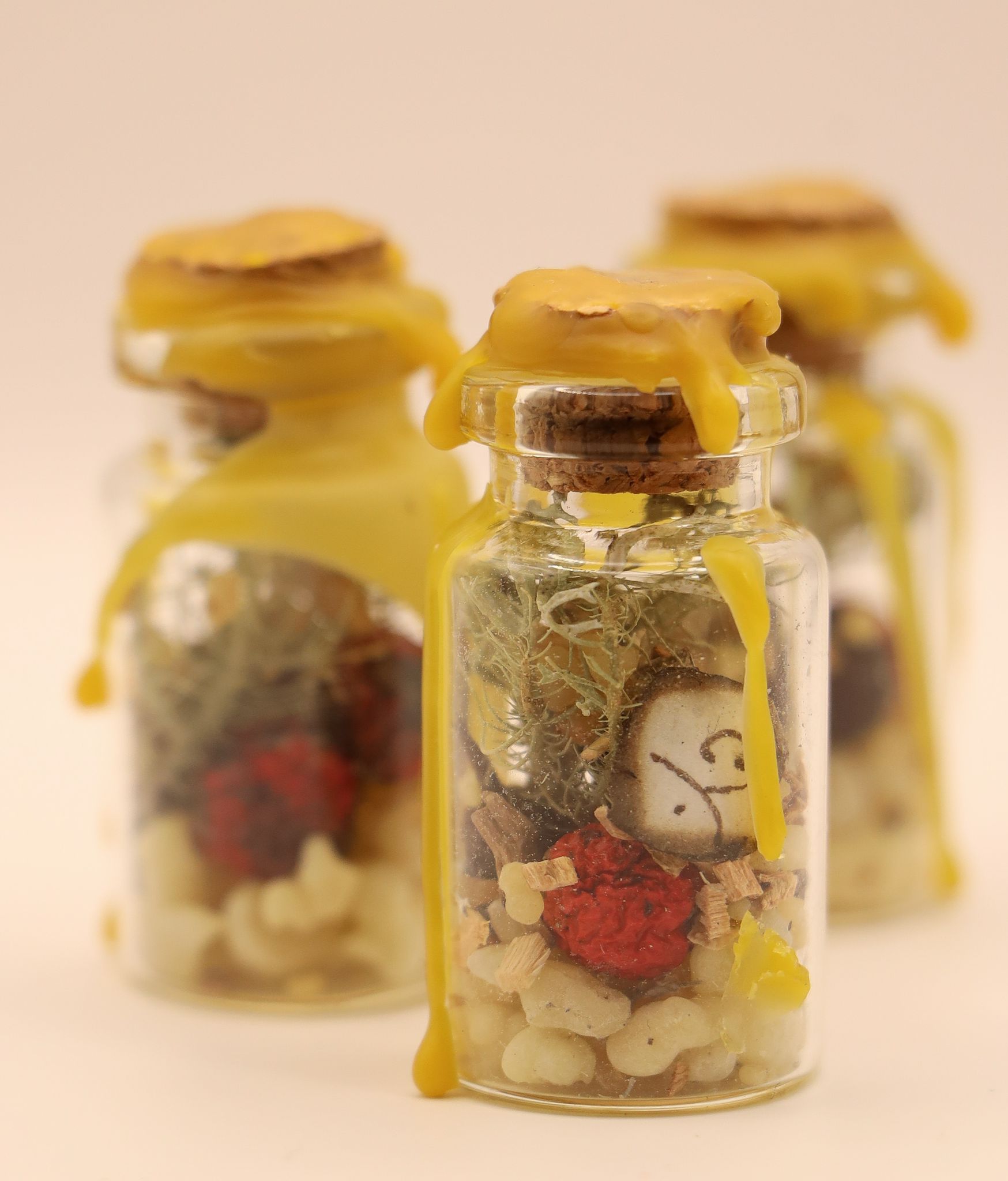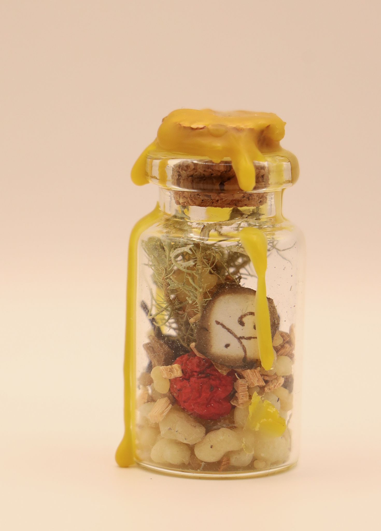 Feito sob a luz do luar, contém símbolos mágicos e encantamentos. Neste pequeno frasco selado a cera encontras um enorme poder. Com ervas, resinas, sementes, entre outros.